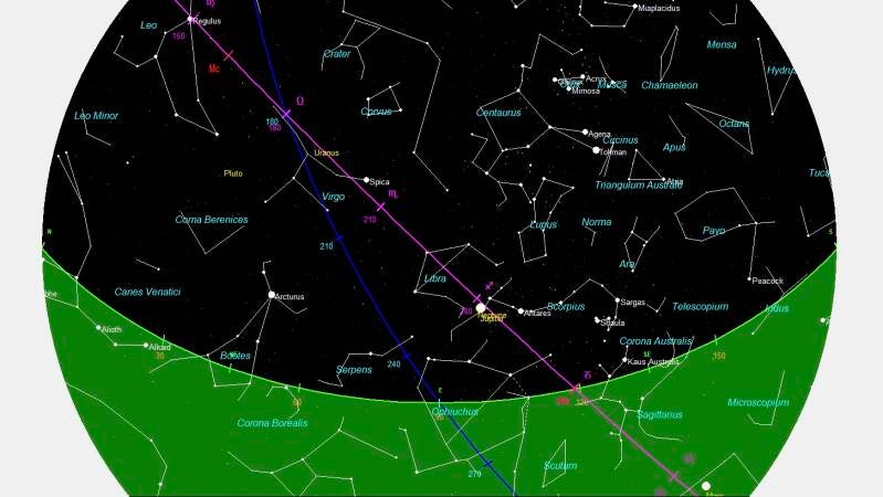 Het groene gedeelte is het gedeelte dat zich onder het horizonvlak bevindt en dus niet te zien is. De blauwe lijn is de lijn van de evenaar, maar die is in dit geval niet zo belangrijk. De Oude Grieken namen de ecliptica als uitgangspunt en dat is de roze/paarse lijn. Het is deze lijn waar alles omdraait. Dit is de lijn waar de Zon zich op voortbeweegt en aangezien de planeten om de Zon draaien, zijn ook zij altijd in de buurt van deze lijn te vinden.
